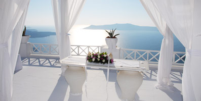 Dana Villas Wedding Terrace is one of the most romantic wedding locations. The astonishing view to Fira, to Imerovigli, Oia and of course to the volcano, in a luxurious, dressed in white, venue, will welcome your unique moments of happiness.
